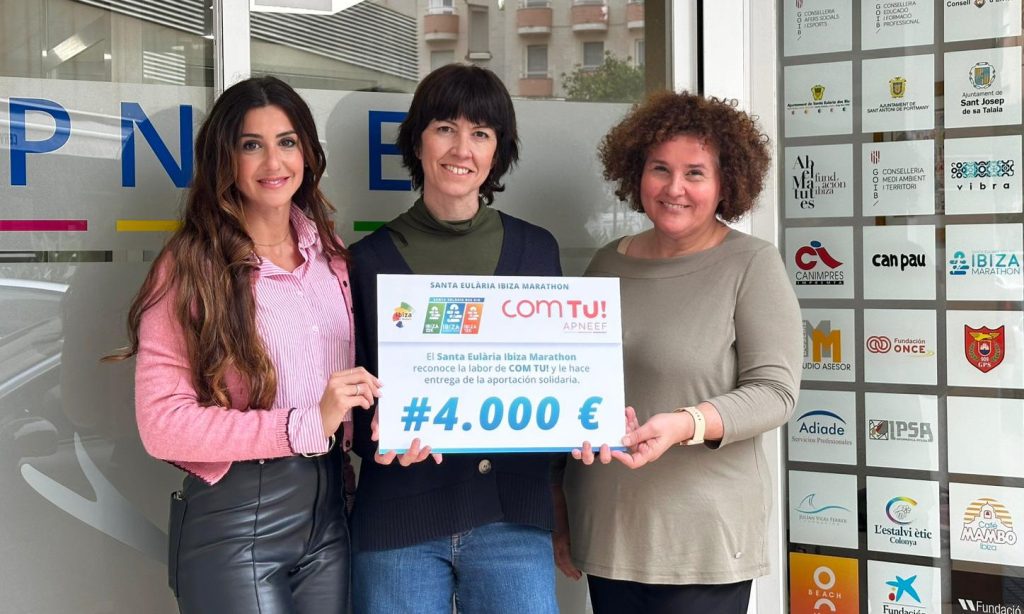 La organización del Santa Eulària Ibiza Marathon ha hecho entrega de un cheque por valor de 4.000 € a “Com Tu! APNEEF” (Asociación de Personas con Necesidades Especiales de Eivissa y Formentera), que estrena denominación, pero sigue manteniendo el mismo espíritu y objetivo. La presidenta Noemí Boned ha recibido el importe recaudado en la octava edición de manos de Silvia Comeche, responsable de la prueba deportiva. Esta aportación ha sido posible gracias a las contribuciones realizadas por los participantes en cada una de las tres distancias.