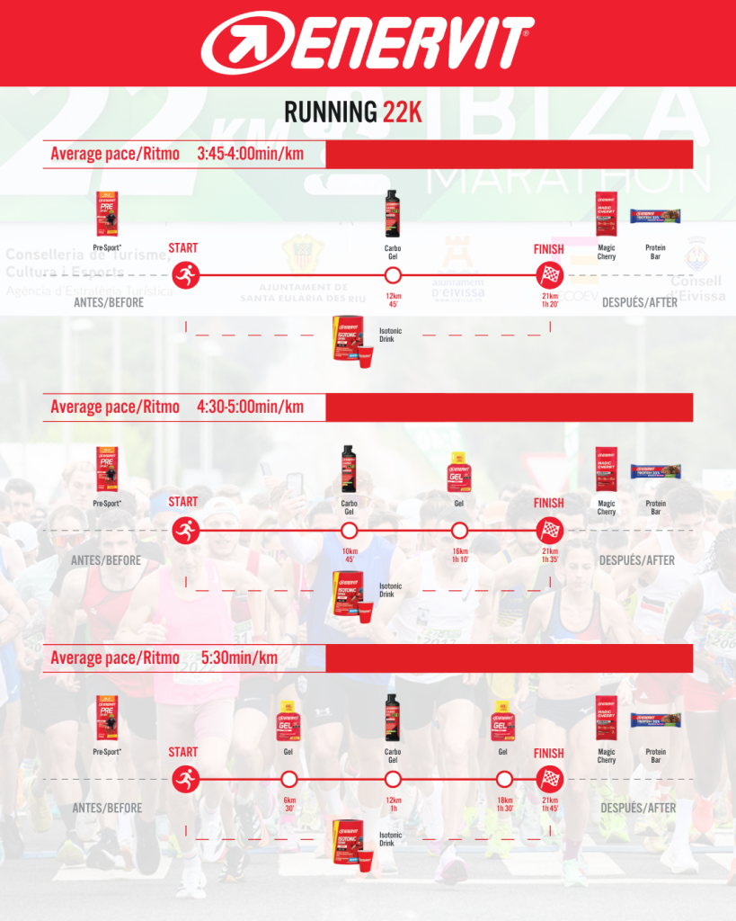 The 22K distance of the Santa Eulària Ibiza Marathon is the second most demanding race in the programme and a solid challenge that deserves respect. Alongside proper training to build a strong physical base, approaching this race with a well-planned sports nutrition strategy is essential to reach the finish line with confidence. ENERVIT offers a wide range of products that can help structure this plan.